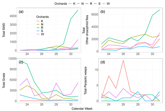 Number of SWD (a); other drosophilid flies (b); gnats (c); and parasitic wasps (d) from 23rd to 31st calendar week at the five orchards. Note the different dimensions of the y-axes.