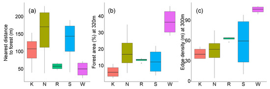 Distance to forest (a), forest area (b), and edge density (c) for the five orchards. Note the different ranges of the y-axes.