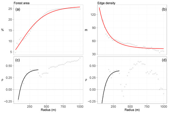 Forest area, edge density, and their Spearman correlation coefficients () with SWD at distances from 80–1000 m in 20 m intervals. Fitted red lines in (a,b) represent results from Gompertz functions (Equation (2)). The black lines in (c,d) are results from limited growth models (Equation (3)).