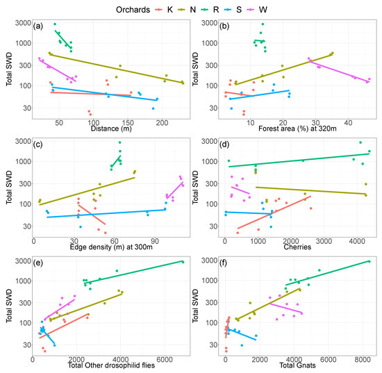Scatterplots between trap catches of SWD and covariables at each orchard. SWD catches are log-transformed. Lines are taken from ordinary regression analyses for each orchard.