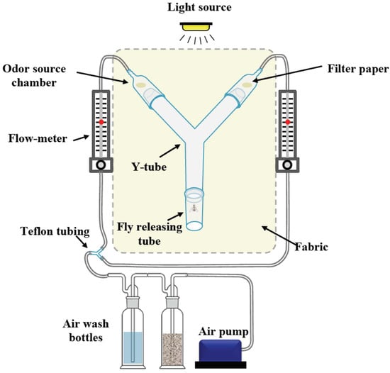 Two-choice olfactometer experiments were conducted in a Y-tube bioassay apparatus, placed in a box made of white fabric (40 cm × 40 cm × 50 cm) to disperse light more evenly and to avoid disturbances by movements of the experimenter (Figure 1). The Y-tube was made of a borosilicate glass tube with an id of 3.1 cm. The length of the upstream arms was 16 cm each and the common arm was 14 cm long. The upstream end consisted of glass odor source chambers (8.5 cm and 2 cm id) containing a stimulus (10 µL) on a WhatmanTM, grade 1, circular filter paper (20 mm diam.). An air flow was created using an Elite 802 pump (Rolf C. Hagen U.K. Ltd., Castleford, UK), pumped through a teflon tubing and passed through series of glass wash bottles for activated charcoal filtering and humidification. The air leaving the wash bottles was split into two teflon tubings, each adjusted using a flow meter (BA-4AR, Kytola instruments, Muurame, Finland, Figure 1), and then entering the glass odor source chamber with an airstream of 0.5 L min−1. Experimental flies were starved for 5 h prior to experiments; individual flies were transferred to vials and moved to a climate chamber (25 °C, 65% RH) 1 h prior to experiment to acclimatize flies.