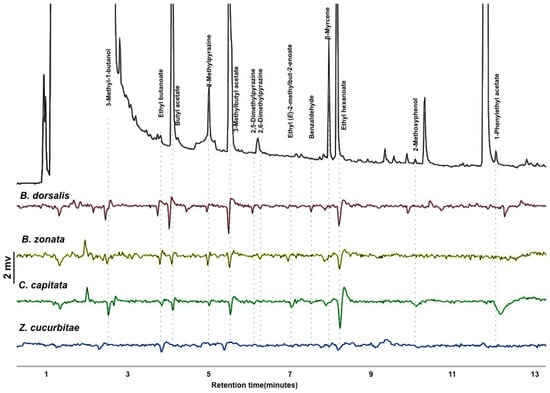 Gas chromatograph-coupled electroantennogram detection response of the four tephritid pest species tested to the headspace extract of the mixture of food-baits. Top trace (black): GC-FID trace of the headspace of the mix of bait; bottom 4 traces (colored): EAD traces for the four fruit fly species tested.