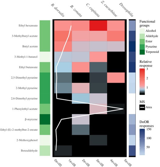 The above plot from left to right is composed of (1) Compound name (2) the functional classes of the compounds (3) antennal sensitivity of the four fruit fly species (B. dorsalis, B. zonata, C. capitata and Z. cucurbitae) to compounds in food baits with the MS area (the sum of ions) (4) simulated olfactory response of D. melanogaster to the compounds. Compounds from five chemical groups were identified to induce an antennal response and include, terpene, pyrazines, esters, aldehyde and alcohols (from dark green to light green respectively). The average relative sensitivity of the fly’s antennae ranges from black (no response) to red (6× averaged EAD response). The olfactory receptors response of D. melanogaster increases from light blue to dark blue, with white tile indicating compounds not present in the DoOR database.