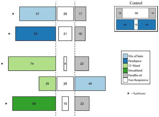 Choice of B. dorsalis females between treatments (mix of baits, headspace, 13 blend and dorsablend) and control (paraffin oil, or mix of bait), in a y-tube olfactometer. Mix of baits, is a mixture of brewer’s yeast waste, baker’s yeast, torula yeast, anamed & GF-120. Top right inset: experiments consisting of (1) headspace against headspace and (2) paraffin oil against paraffin oil. Forty flies were released individually and the percentage of flies that made a choice is presented within the bars, middle bars (white) represent non-responding flies. α = 0.05, * p < 0.05.