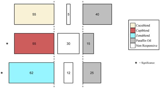 Behavioral response of Z. cucurbitae, C. capitata and B. zonata to cucublend, capiblend and zonablend. Forty flies were released individually and the percentage of flies that made a choice is presented within the bars. Colored bars indicate synthetic blends, gray bars indicate control (paraffin oil) and middle bars (white) represent non-responsive flies. α = 0.05, * p < 0.05.