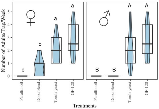Female and male B. dorsalis fruit flies caught per trap in commercial lures (GF-120 & torula yeast) compared to the synthetic dorsablend. Different letters indicate significant differences. Boxplot shows the spread and the violin plot shows density of flies per trap.