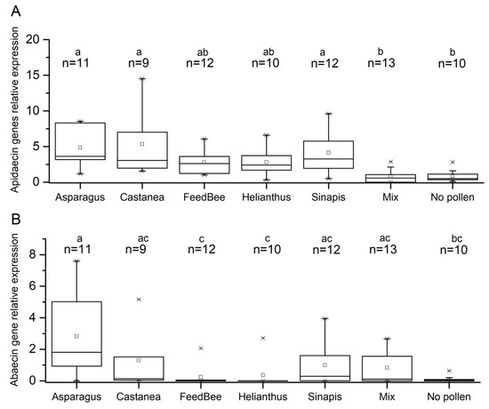 Relative expression of (A) apidaecin and (B) abaecin genes fed different diets. Groups are labelled by small case letters; different letters denote significant differences between groups (independent-samples Kruskal-Wallis test, p < 0.05). Boxes show first and third interquartile range with line, median is denoted. Stars represent outliers, n = number of analysed individual bees.
