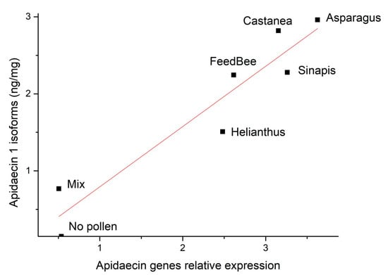 Recent studies confirmed the changes in gene expression of AMPs within honey bee immune gene network in response to major bee pathogens and parasites [21,23,43,44]. However, it is widely known that the level of gene expression does not necessarily correlate with levels of active peptide molecules in bee tissue. This may occur e.g., when the peptide translation is regulated by microRNA [45,46]. Here, we found a positive correlation between apidaecin gene expression in the fat body and apidaecin levels in bee thoraces (Figure 3). Focused on apidaecins, they are secreted as preproteins: apidaecin type 73, type 22 and type 14, these preproteins are secreted by genes Apid73 (Gene ID 406115), Apid22 (Gene ID 494510), and Apid14 (Gene ID 406140). The preproteins are finally spliced into three active isoforms detected on peptide level: apidaecin 1 (isoforms 1A and 1B), apidaecin 2, and one predicted apidaecin from cDNA library [13,15].