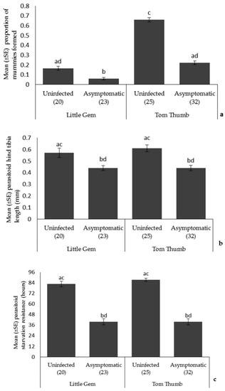 The effect of asymptomatic B. cinerea infection status and plant variety on Mean ± SE (a) proportion of parasitoid mummies formed; (b) parasitoid hind tibia length; and (c) parasitoid starvation resistance. Number of plant replicates per treatment is shown below each bar; treatments sharing the same letters above each bar are not significantly different at p < 0.05 following post-hoc tests.