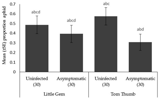 Mean ± SE proportion of aphids Myzus persicae orientating in an olfactometer trial towards two varieties (Little Gem, Tom Thumb) of uninfected or asymptomatically infected lettuce plants. Number of replicates per treatment is shown below each bar; treatments sharing the same letters above each bar are not significantly different at p < 0.05 following post-hoc tests.