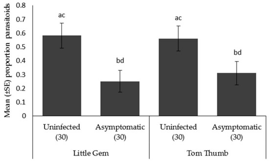 Mean ± SE proportion of parasitoids Aphidius colemani orientating in an olfactometer trial towards aphids on two varieties (Little Gem, Tom Thumb) of uninfected or asymptomatically infected lettuce plants. Number of replicates per treatment is shown below each bar; treatments sharing the same letters above each bar are not significantly different at p < 0.05 following post-hoc tests.