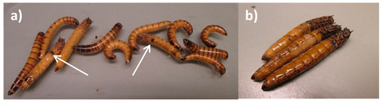 (a) Diseased Z. morio larvae displaying melanized stains before death (white arrows); (b) Z. morio larvae in a process of melanization, 48 h after death.