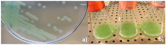 Colony morphology and in vitro cultivation: By direct observation of the hemolymph from diseased larvae, the presence of bacilliform non-sporulated, non crystalliferous bacterial cells was confirmed. In vitro cultivation in nutrient agar resulted in just one type of colonies: greenish, convex but flattened as growth progressed, round with slight irregular borders and slimy (Figure 3a), suggesting a monospecific infection. In vitro liquid cultivation in nutrient broth resulted in a yellow-green pigmented culture that changed color to green-blueish when agitated (Figure 3b).