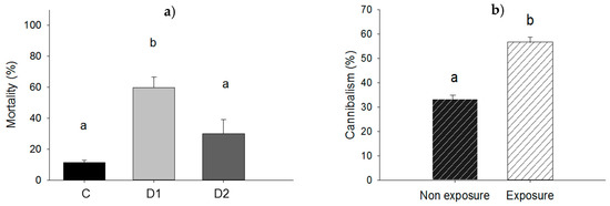 (a) Mortality rate of larvae force-fed with cells of P. aeruginosa at doses D1 of ≈1.1 × 107 UFC/larva (D1), D2 of ≈5.4 × 106 UFC/larva (D2) or 10 mM MgSO4 solution as a control (C); (b) cannibalism rate among larvae in groups exposed to ≈2.2 × 108 UFC of P. aeruginosa. Bars having no letters in common differ significantly (p ≤ 0.05). Error bars indicate the standard error of the mean.