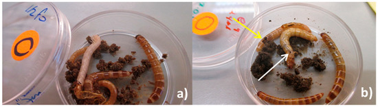 (a) Larvae molting in group exposure experiment; (b) injury due to cannibalism in larva’s proleg (white arrow) and cannibalized dead larva (yellow arrow).