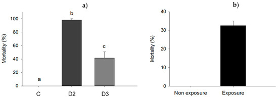 (a) Mortality rate of larvae injected subdermal with either dose 2 (D2) of ≈5.4 × 106 UFC/larva), dose 3 (D3) of ≈5.4 × 105 UFC/larva) of P. aeruginosa cells, or 10 mM MgSO2 solution as a control (C); (b) mortality of Z. morio larvae subjected to P. aeruginosa exposure by wounding. Bars having no letters in common and differ significantly (p ≤ 0.05). Error bars indicate the standard error of the mean.