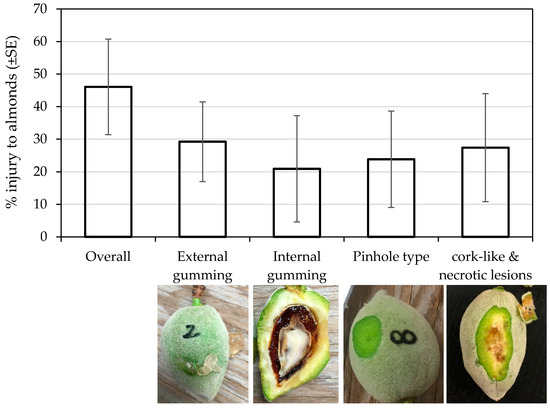 H. halys infestation at the site caused substantial external injury (gumming) to the developing nuts. The in-situ observational study showed an average of ~22% gumming nuts with the range of 8 to 58% (Table 1). Although H. halys feeding at the early stage of almond development results in aborted nuts (J.P.R. unpublished data), the substantial number of gumming nuts were firmly attached to a tree when we discovered H. halys and its damage in the almond orchard (late May–early June). BMSB may potentially attack almonds throughout the season beginning mid-March, although the extent of economic damage at different times of the year has yet to be determined. We also observed multiple feeding sites within the fruit and multiple injured fruits in a cluster within the branch. Although H. halys was first detected in May, gumming signs in different-sized nuts (Figure 2) indicated that the damage might have started earlier. From the same three tree rows, 150 random developing nuts had external gumming (29.23%), internal gumming (20.9%), pinhole (23.8%) and necrotic and cork lesion (27.4%) to the fruit (Figure 3). We did not evaluate the correlation of the feeding injury to kernel damage at harvest. Although there might be some overlap in feeding injury caused by H. halys and other hemipterans (i.e., native stink bugs; leaffooted bug, Leptoglossus spp.) [16,17], the nature of feeding injury and severity reported here are similar to what has been reported for H. halys feeding injury in peach and apple [18,19,20].