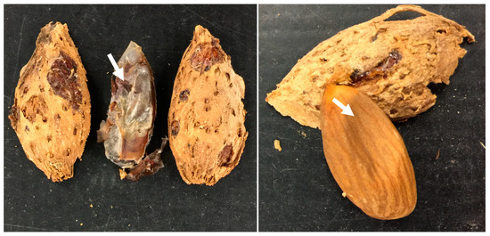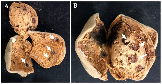 H. halys feeding injury to (A) hull and (B) shell of almond at harvest. White arrows indicate the necrotic feeding spots.