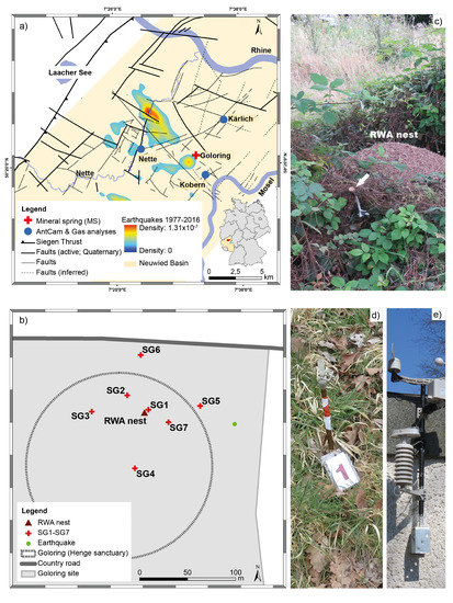 Location of the Goloring study site (red cross) ≈15 km SE of the Laacher See volcano within the Neuwied Basin (light yellow area). The map (a) shows tectonic structures (black lines) and probability density of the earthquake events from 1977–2016 related to the Ochtendunger Fault Zone (OFZ; rainbow contours showing the hot spots (red color) of earthquake events within the OFZ rarely exceeding local magnitude of 4.0; modified after [28]). The inset shows the location of the study site within Germany. CO2, He, and Rn were sampled at the Goloring site with its Iron-aged henge sanctuary from a RWA nest, soil, and the ambient air; no fault zones had been reported and identified previously from the Goloring study site (b). Photographs show (c) the permanent nest gas probe (white arrow) and the RWA nest, (d) example of a permanent soil gas (SG1) probe with marked flag, and (e) the meteorological station (all photographs: G. M. Berberich).