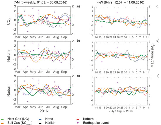 We observed no effects of earthquakes on gas concentrations in the biweekly (7-M) samples. This is attributable to either: (a) the small size of the earthquakes; (b) their large distance (>10 km) from the Goloring site; or that (c) biweekly sampling intervals missed the influence of the small earthquakes. Alternatively, evidence of seismic influence on fluctuation patterns were observed after the earthquake that occurred on 3 August 2016 at Nickenich (≈11 km) while we were sampling every 8 h. The decline of CO2, He, and Rn concentrations in NG and SG observed ≈1 day before the earthquake can be explained by: (1) an increase in compressive stress; (2) volume changes of the pore fluid or rock matrix; or (3) a permeability change of conduits at the nest and soil sample locations [16,49]. As there was only one such nearby event, however, we cannot assert that there is a general relationship between earthquakes and nest or soil gas concentrations. The recent occurrences of deep earthquakes that are related to magmatic processes at the lower crust suggest continuous monitoring in this youngest volcanic field in Germany. Such data also would help assess relationships between gas flux dynamics and earthquake events in the Neuwied Basin.