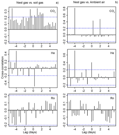 Cross-correlation of the time-series of NG vs. mineral springs (8-hour median smoothed) for (a) CO2, (b) He, and (c) Rn for the 4-W samples. Blue dashed lines indicate confidence thresholds.