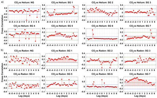 Cross-correlations of time-series of (a) CO2 vs. He and (b) CO2 vs. Rn (8-hour median smoothed) in NG and SG from the 4-W samples. Blue dashed lines indicate confidence thresholds.