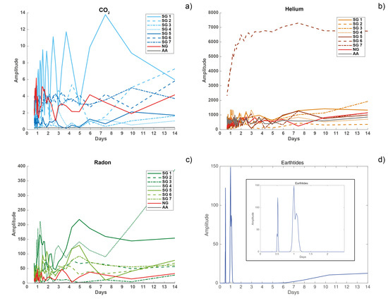 Common synchronous infradian degassing rhythms of CO2, He, and Rn were observed in the 4-W samples of AA, NG, and SG after 2, 3, 4 and 6 days (Figure 6; Appendix C). There was no common CO2 maximum peak (Figure 6a; Appendix C, Table A1). Common He maxima occurred at 7 (NG, SG2), 22 (SG5–SG7), 30 (SG1) and 45 days (SG3; Figure 6b; Appendix C, Table A2), whereas common Rn maxima were observed for 15 days (AA, SG7; Figure 6c; Appendix C, Table A3). At a period of 45 days, Rn maxima were observed only in SG4 (Appendix C, Table A3). Earth tides peaked at periods of 0.5 days and 1 day (Figure 6d).
