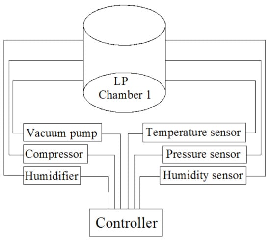 A low-pressure system (DC-0.15, Dachang refrigeration equipment engineering Co. Ltd., Jiangxi, China), consisting of 5 identical stainless steel low pressure chambers (37 cm diameter × 30 cm height), was used in this study. The setting pressure, humidity, and temperature of each chamber were obtained by a vacuum pump, humidifier, and compressor, and these parameters were independently measured and recorded in each chamber during the treatment with the accuracy of ± 200 Pa, ± 2 °C, and ± 2% RH, respectively. All data from the five humidity, pressure, and temperature sensors in the low-pressure system were sent to the same controller and displayed on a same screen. A diagram of one of the identical low-pressure chambers is shown in Figure 1.