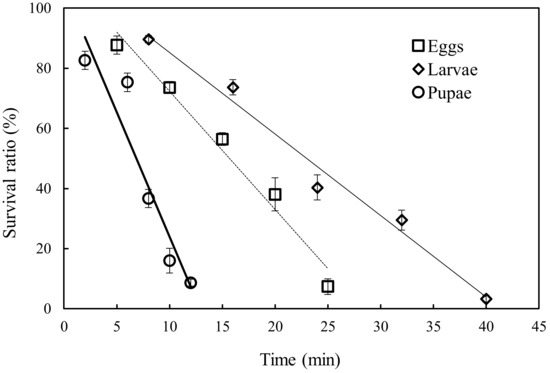 The survival ratios for P. interpunctella eggs, larvae, and pupae under different exposure times at 1.33 kPa and 25 °C.