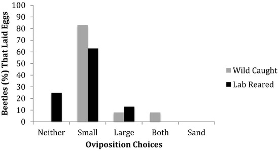 To address the question as to whether there is a preference for large particle versus small particle substrate, the oviposition pattern for each beetle (wild-caught and laboratory-reared) was scored and analyzed using categorical data analysis techniques. A single female beetle was scored as either laying her eggs in one mulch substrate or the other, sand, multiple substrates in the same trial, or none. The preferences of wild-caught and laboratory-reared beetle oviposition substrates were compared using a Chi-Squared Test of Independence. A Chi-Squared Goodness of Fit Test was used for wild-caught and laboratory-reared beetles separately to assess if oviposition would be equally distributed across substrates. Within each beetle type, the number of eggs laid per beetle in each substrate was compared using a nonparametric Wilcoxon Ranked-Sum Test.