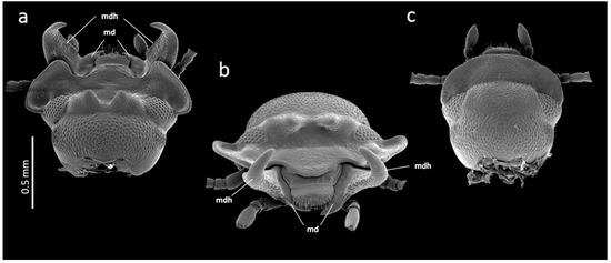 SEM micrographs of the head of Gnatocerus cornutus. (a) Dorsal view of a male head, (b) frontal view of a male head, (c) dorsal view of a female head. md: mandible; mdh: mandibular horn.
