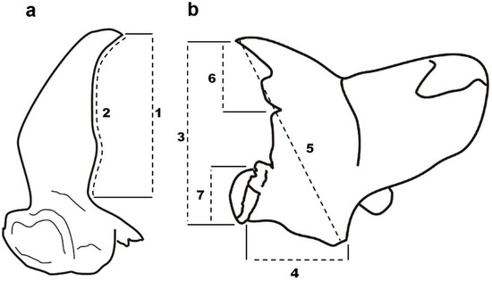 Measurements of (a) horns and (b) mandible parts of Gnatocerus cornutus. 1 and 2: horn length; 3: mandible length; 4: mandible width; 5: diagonal; 6: incisor length; 7: molar length.