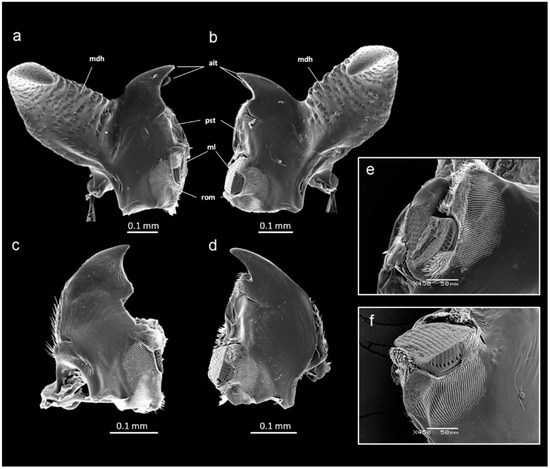 SEM micrographs of the mandibles of Gnatocerus cornutus. (a) Dorsal view of a left male mandible, (b) dorsal view of a right male mandible, (c) dorsal view of a left female mandible, (d) dorsal view of a right female mandible, (e) detail of the molar region of a left male mandible, (f) detail of the molar region of a right male mandible. ait: apical incisor teeth; mdh: mandibular horn; ml: mola; pst: prostheca; rom: rows of microtrichia.