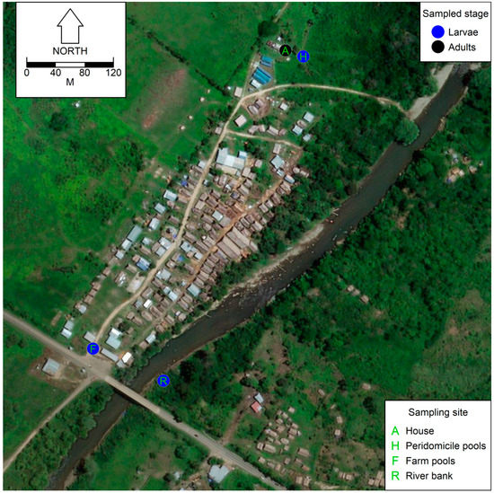 Mosquitoes, adults and larvae, were monthly collected from May 2016 to December 2017. Anopheles spp. adults mosquitoes were collected by human landing catch [22], a highly sensitive mosquito sampling method for anopheline mosquitoes [42], at the peridomicile of a housing cluster in Ipetí-Guna (Figure 2). This housing cluster was chosen given the abundance of nearby positive larval habitats. It is worth highlighting that distance from the sampling location to the huts in the housing cluster ranged between 5 m and 10 m. The adult mosquito collections were made over three consecutive nights between 18:00 h and 21:00 h by two trained collectors that switched positions to minimize bias in the abundance estimates [41]. To minimize the infection risk, catches followed World Health Organization (WHO) biosecurity guidelines [43]. Anopheles spp. larvae were collected by dipping larval habitats near the households, but also on the Ipetí-Guna River banks and in the farmlands of the community (Figure 2), following the procedure recommended by WHO, of ten dips per square m at a sampling location [43]. Larvae and adults mosquitoes were placed in Petri dishes, which were coded by collection site and date, and then mosquitoes were morphologically identified using a dissection scope and taxonomic keys for the anophelines of Mesoamerica [44,45] and the reference collection at the Instituto Conmemorativo Gorgas de Estudios de la Salud (ICGES).