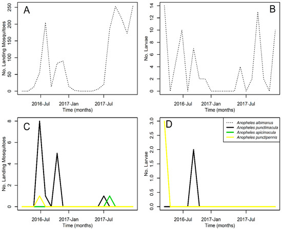 Monthly mosquito abundance time series (A) Anopheles albimanus adults (B) Anopheles albimanus larvae (C) Less common Anopheles spp. adults (D) Less common Anopheles spp. larvae. Adults were sampled by human landing catch, and larvae using a dipper. Collected Anopheles spp. are presented in the inset legend of panel (D). All time series correspond to the studied period, from May 2016 to December 2017. For further details about the sampling, please refer to the mosquito sampling section in the methods.