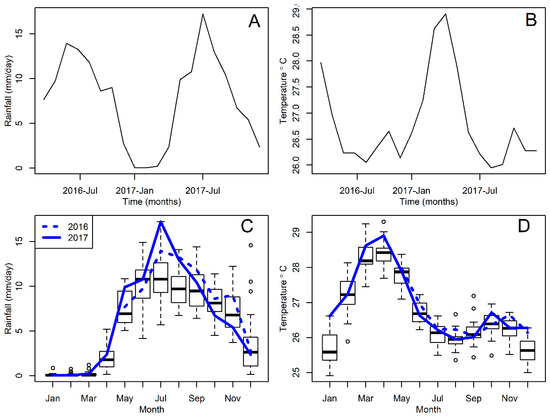 Monthly weather time series (A) Rainfall (B) Temperature (C) Seasonal rainfall (D) Seasonal temperature. In panels (A,B) the time series correspond to the studied period, from May 2016 to December 2017. In panels (C,D) each monthly boxplot represents the distribution of records between 1998 and 2017, and the studied period is highlighted by blue lines described in the inset legend of panel (C). In the boxplots, the line at the center of each box indicates the median of the collected weather records.