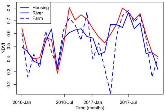 We employed images for the NDVI from the biweekly, 250 m resolution, vegetation product (M*D13A3), courtesy of the NASA Land Processes Distributed Active Archive Center, USGS/Earth Resources Observation and Science (EROS) Center, Sioux Falls, South Dakota [50]. We used the R package MODIStsp [51] to download and clip NDVI images from the study period. Further GIS procedures for the downloaded images were made using the package raster also in the statistical software R [52]. Briefly, all images from the study period were stacked into a geotiff, from which the monthly values were extracted, generating a time series in the process [20].