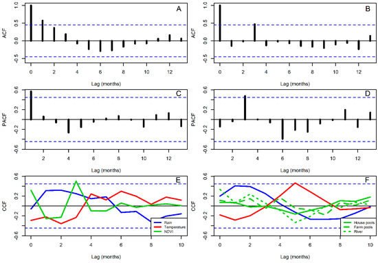 Correlation functions (A) Anopheles albimanus adult abundance autocorrelation function, ACF; (B) An. albimanus larvae abundance ACF; (C) An. albimanus adult abundance partial ACF, PACF; (D) An. albimanus larvae abundance PACF. Cross correlation functions, CCF, between An. Albimanus; (E) adults and rainfall, temperature and NDVI, based on the data for House (F) larvae and rainfall, temperature and NDVI, based on the data for house pools, farm pools and the river. The inset legend of panel (E) shows the color coding for the different environmental variables, while the inset legend of panel (F) shows the line coding for the NDVI measured at the different sampling locations. In each plot, blue dashed lines indicate the confidence intervals within which correlations are expected to arise by random (p > 0.05).