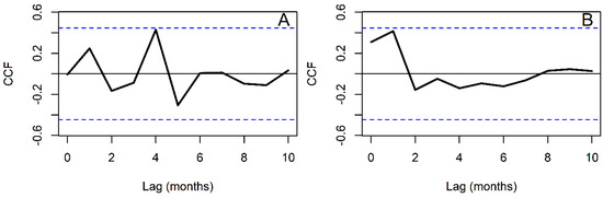 Meanwhile, the association between adults and larvae was not statistically significant at any time lag, yet it had a peak at four month lag (Figure 7A). The association between larvae and adults was highest at one month lag (Figure 7B), but not statistically significant, yet higher than the four month lag association between adults and larvae.