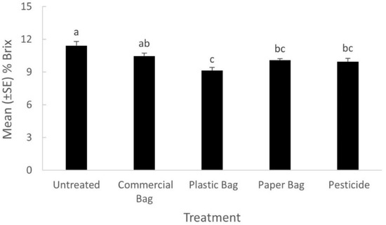 Mean (±SE) percent of Brix of apple fruit in 2015. Bars with different letters denote significant differences among treatments (Tukey’s HSD test, p ≤ 0.05).