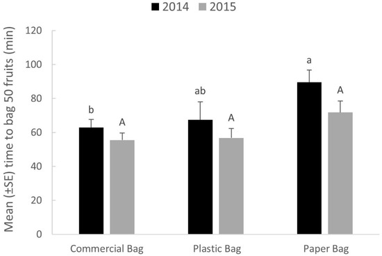 Mean (±SE) effect of bag type on apple bagging times in 2014 and 2015. Bars with different letters denote significant differences among treatments for each year (Tukey’s HSD test, p ≤ 0.05).