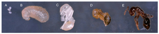 Developmental stages of the S. invicta worker caste: (A) egg; (B) larva; (C) early stage (white) pupa; (D) late stage pupa or pharate adult; (E) adult. RNA samples were extracted from representatives similar to (B,C).