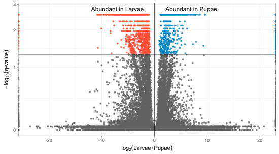 Eight transcripts related to immune processes were differentially expressed (Table S2). Two toll-like receptor transcripts were differentially expressed, with one being more abundant in the larval stage and the other more abundant in the pupal stage. One “phenoloxidase 2” transcript was also more abundant in the larval stage.