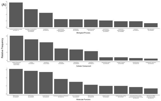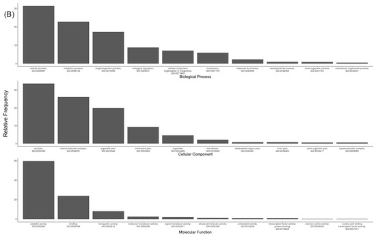 Ten most common Gene Ontology (GO) molecular function, cellular component and biological process categories of S. invicta transcripts: (A) full ontology, (B) slim ontology.