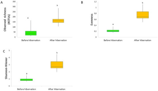 Observed richness (A), evenness (B), and Shannon–Wiener diversity (C) boxplots of the gut bacteria occurring in the midgut and/or ileum in indoor-reared bumblebee queens (Bombus terrestris) before (n = 15) and after hibernation (n = 15). The boxplots show the upper and lower quartiles; the whiskers indicate variability outside the upper and lower quartiles. Further, the median is plotted. Diversity indices were significantly different (p < 0.05) between treatments (Shannon–Wiener values were first exponentially transformed before performing the statistical analysis).