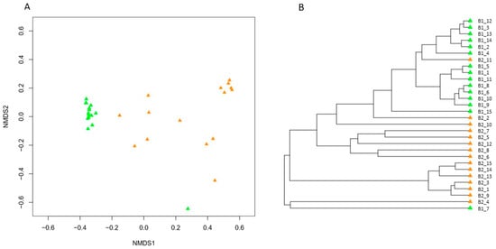 (A) Non-metric multidimensional scaling (NMDS) ordination (stress value = 0.09) based on Bray–Curtis similarities depicting the gut (midgut and ileum) bacterial community composition of indoor-reared bumblebee queens (Bombus terrestris) before (green; n = 15) and after hibernation (orange; n = 15). The distance between different points on the plot reflects the similarity level in bacterial community composition: the more similar the bacterial communities, the smaller the distance between the points. (B) UPGMA (Unweighted pair group method with arithmetic mean) dendrogram visualization of the clustering analysis.