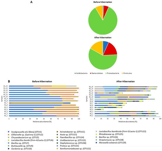 (A) Relative abundance (%) of the bacterial phyla found in the midgut and/or ileum of indoor-reared bumblebee queens (Bombus terrestris) before (n = 15) and after hibernation (n = 15). (B) Gut bacterial community composition at the level of operational taxonomic units (OTUs). Only the most abundant OTUs (i.e., with a mean sequence relative abundance (n = 30) >1%) are represented in the figure. OTUs were identified by a BLAST (basic local alignment search tool) search against type materials in GenBank and identified up to species level if only one top hit was obtained. Note that the Paenibacillus OTU (OTU14) is not related to Paenibacillus larvae, which is a species lethal to honey bee and bumblebee larvae. The highest sequence similarity was found with type strains of Paenibacillus amylolyticus, P. pabuli, P. taichungensis, P. tundra, P. tylopili, P. xylanexedens, and P. xylanilyticus (for all 100% sequence identity on a total of 250 bp).