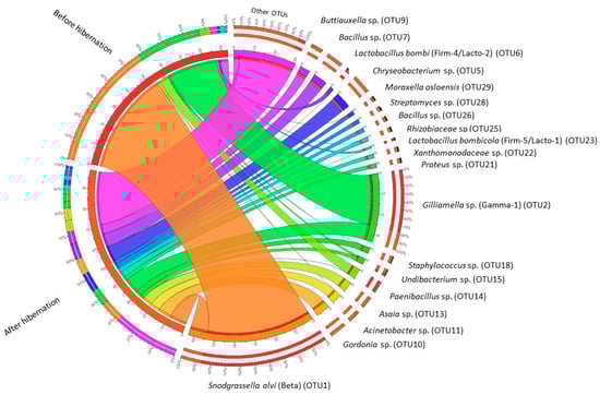 Circular visualization of the occurrence and abundance of gut bacterial operational taxonomic units (OTUs) in bumblebee queens (Bombus terrestris) before (n = 15) and after hibernation (n = 15). Thickness of the ribbon refers to the number of reads assigned to a treatment. The outer ring summarizes the relative abundance of OTUs. Only the most abundant OTUs (i.e., with a mean relative abundance (n = 30) ≥1%) are represented in the figure. All other OTUs were grouped together in “Other OTUs”. OTUs were identified by a BLAST search against type materials in GenBank, and identified up to species level if only one top hit was obtained. Data was parsed with Circos table viewer []. Note that the Paenibacillus OTU (OTU14) is not related to Paenibacillus larvae, which is a species that is lethal to honey bee and bumblebee larvae. The highest sequence similarity was found with type strains of Paenibacillus amylolyticus, P. pabuli, P. taichungensis, P. tundra, P. tylopili, P. xylanexedens, and P. xylanilyticus (for all 100% sequence identity on a total of 250 bp).