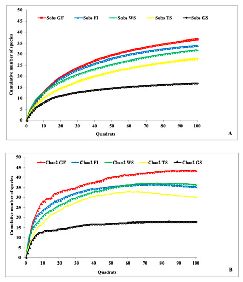Accumulation curves of the observed (A) and estimated species richness (B) in the visited habitats.