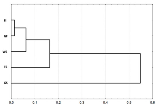 Classification of visited habitat types based on their respective termite’s species composition using the nearest-neighbor method (Unweighted Pair-Group Method using Arithmetic Averages), with 1—Jaccard index as the distance between groups. Abbreviations: FI = Forest Island, GF = Gallery Forest, WS = Woodland Savanna, TS = Tree Savanna, GS = Grassy Savanna.